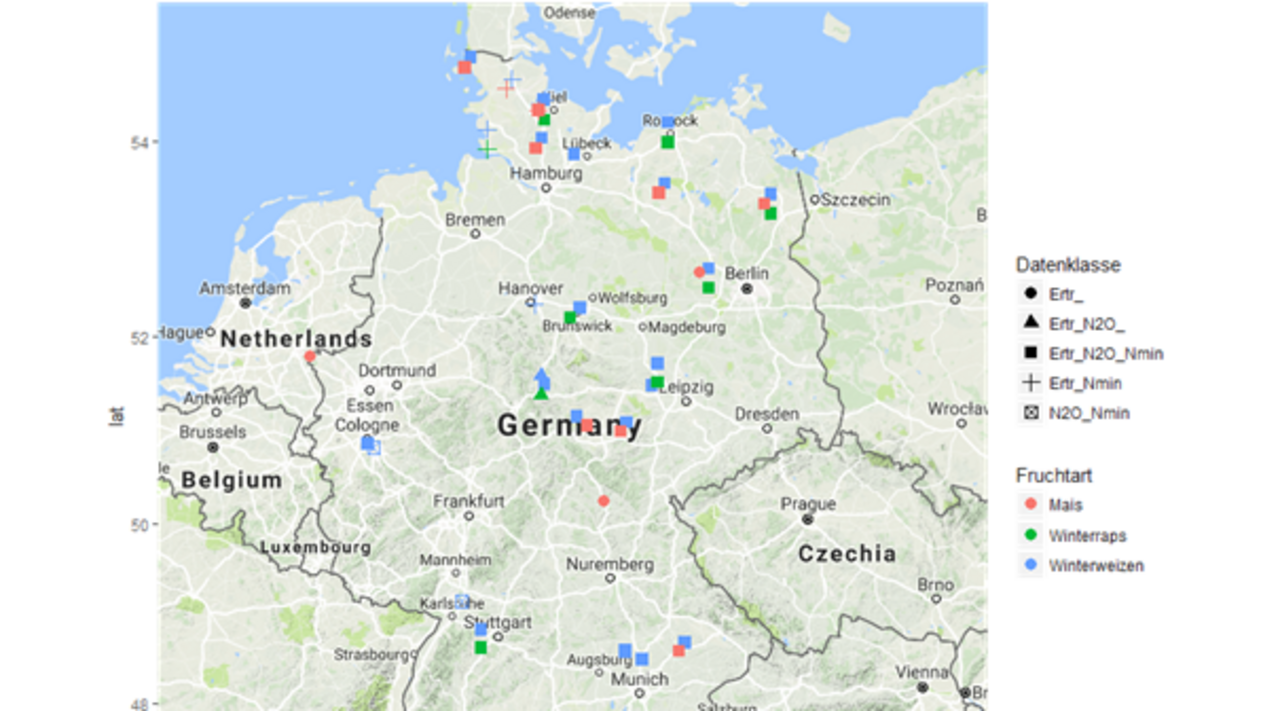 Um die Vorhersagegüte und Prognosefähigkeit von prozessbasierten Modellen für die NAWARO-Kulturen Mais, Weizen und Raps in Deutschland zu untersuchen, wird ein möglichst umfassender Datensatz von Feldexperimenten zusammengestellt (siehe Abbildung oben). In diesen Experimenten erfasste Lachgas-Emissionen, Ernteerträge und Nitrat-Auswaschungen werden herangezogen, um vier Modelle zu parametrisieren und zu bewerten. Um den Effekt von Datenunsicherheiten genauer zu untersuchen, werden Umfang und Datenqualität vorhandener Datensätze (Feldexperimente und flächenhaft vorliegende Daten für NRW) schrittweise verringert und die Unsicherheiten der Modellprognosen für verschiedene Modelle und Datenqualitäten verglichen.