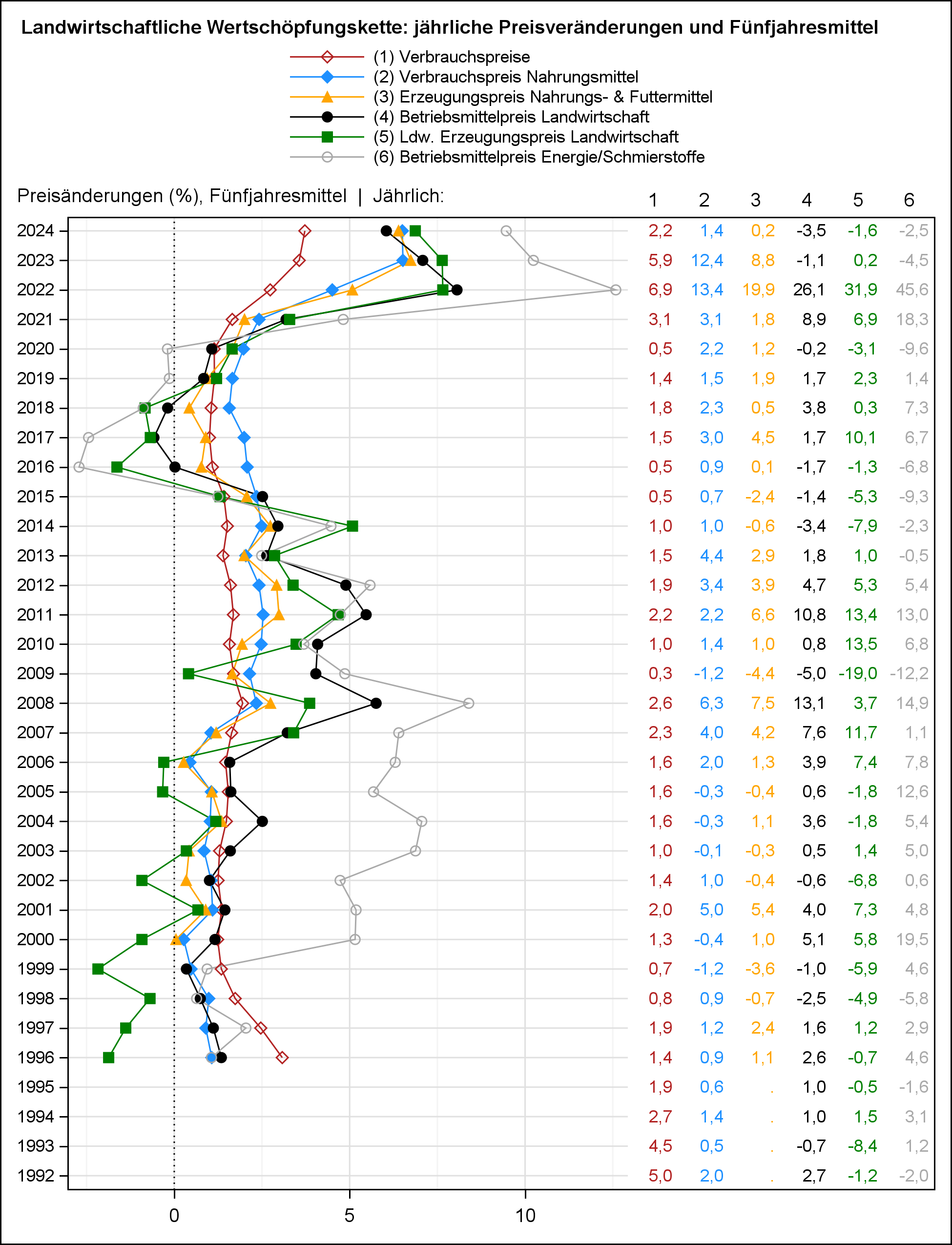 Abbildung 1 zeigt die Fünfjahresmittel der Preisänderungen nach 1991 für die verschiedenen Stufen der landwirtschaftlichen Wertschöpfungskette. Die Tabelle in der Abbildung gibt die Werte der jährlichen Änderungen dazu an. Die heutigen Preisentwicklungen stehen nicht mehr mit den Mustern im Einklang, die in den Jahrzehnten vor der Jahrtausendwende beobachtbar waren. Nach 1950 wurde der Anpassungsdruck, unter dem die Landwirtschaft steht, oft durch eine „Preis-Kosten-Schere“ erklärt, die sich aus dem folgenden Dreisprung ergibt: (1) die Agrarpreise sinken, (2) die Betriebsmittel- & Verbrauchspreise steigen und (3) die Lebensmittelpreise steigen weniger als andere Verbrauchspreise.