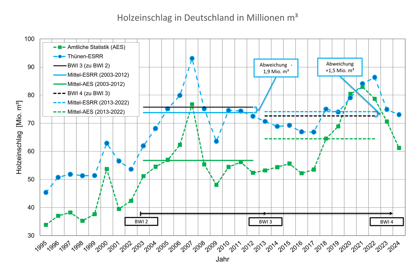 Im Mittel werden durch die amtliche Einschlagsstatistik über den gesamten Betrachtungszeitraum nur etwa 81 % des tatsächlichen Einschlages erfasst. Das bedeutet, dass durchschnittlich jährlich ca. 13,0 Mio. m³ Holzeinschlag nicht erfasst wurden. Die Ergebnisse der verwendungsseitigen Rückrechnung weichen im Durchschnitt (2003 – 2012) um etwa 1,9 Mio. Kubikmeter (Erntefestmeter ohne Rinde) bzw. um ca. 2,5 % von den Ergebnissen der dritten Bundeswaldinventur (BWI3 2014) ab. Allerdings zeigt sich, dass sich der Holzeinschlag nach der amtlichen Einschlagsstatistik in den letzten Jahren zeitweise dem berechneten Holzeinschlag nähert, aber aktuell wieder deutlich niedriger liegt.