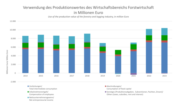In the form of a macroeconomic calculation, in EFA-table B 1, the gross value added of the forestry sector is initially derived from the total output at basic prices and the total intermediate input. The net value added is calculated by deducting the consumption of fixed capital from the gross value added. The factor income is then calculated by deducting other taxes on production and other subsidies on production. By further deducting the compensation of employees, the operating surplus and mixed income is determined. Then, by deducting the balances from rents paid and received, leases and interest, the entrepreneurial income is calculated.