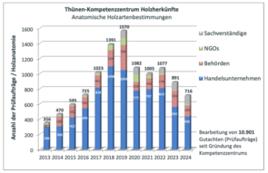 The Thünen Centre of Competence on the Origin of Timber has achieved a significant milestone. Since its establishment in March 2013, over 10,000 test orders for the anatomical identification of internationally traded timber and wood products have been processed. The majority of these, approximately 7,500 orders, come from trading companies. These companies submit test orders to proof and verify the declarations and wood species compositions in accordance with the guidelines of the European Timber Trade Regulation (EUTR/EUDR) and CITES convention. During the same period, approximately 1,800 reports were prepared for the relevant control authorities. Additional inquiries come from NGOs, experts, and also private individuals seeking the expertise of the Competence Center. The proportion of test orders from foreign companies and authorities is approximately 25%, emphasizing the international focus and perception of the Centre of Competence.