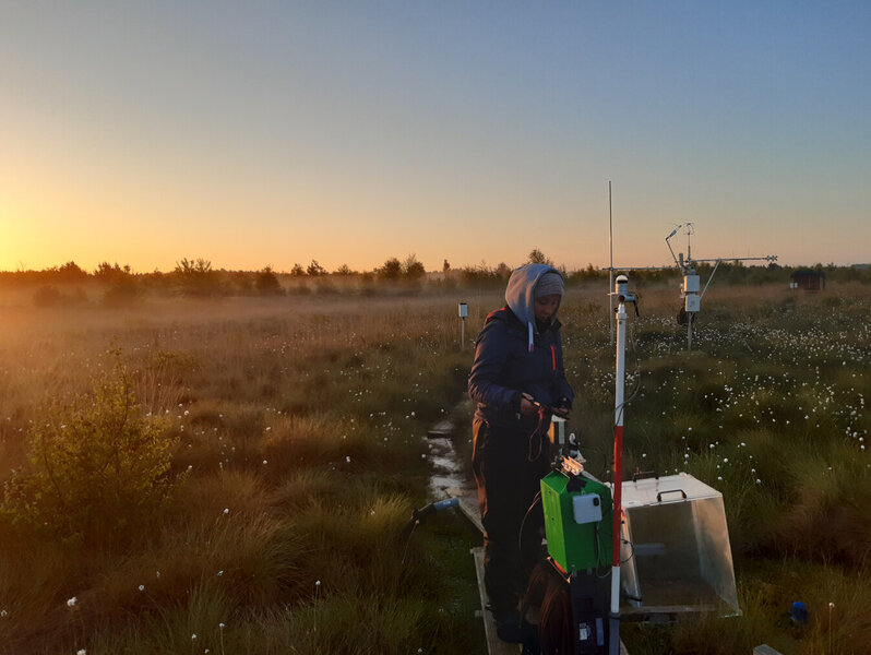 Wir haben den Einfluss von Birkenbewuchs, niedrigeren Wasserständen und veränderter Vegetation (also Folge unzureichender Wiedervernässung) auf die Methanemissionen untersucht. Es gab zwei wiedervernässte Flächen im gleichen Moorgebiet, eine mit naturnaher Vegetation und eine mit einem dichten, jungen Birkenbewuchs. Wir haben auf den verschiedenen Mikrostrukturen (Bulten / Schlenken) und an den Ästen die Methanemissionen gemessen und sie zu Blattflächenindex, Wasserständen, PAR (photosynthetisch aktive Strahlung) und weiteren Parametern in Beziehung gesetzt. Wir haben zusätzlich verschiedene Methoden verglichen, um Jahresbilanzen zu berechnen. Für unsere Daten hat es sich hierbei als beste Methode herausgestellt, den Wasserstand und die Bodentemperatur mit einzubeziehen.