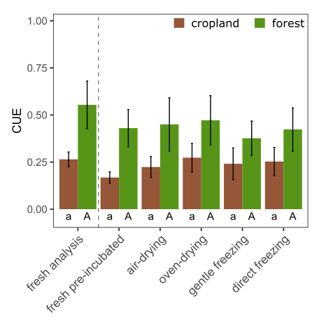 In einem methodischen Experiment fanden wir heraus, dass die mikrobielle Kohlenstoffnutzungseffizienz (18O-CUE), anders als die mikrobielle Aktivität, nicht signifikant von der Vorbehandlungsmethode beeinflusst wird. Damit eröffnet sich die Möglichkeit auch getrocknete Proben zur Bestimmung der CUE zu nutzen.