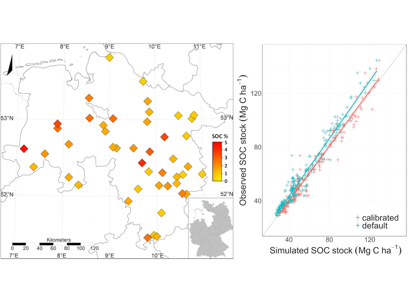 Simulationsmodelle werden immer wichtiger für die Vorhersage von Veränderungen der Kohlenstoffvorräte im Boden. Eine vorherige Validierung ist jedoch unerlässlich, um die Zuverlässigkeit und Anwendbarkeit der Modellergebnisse zu beurteilen. Ziel dieser Studie war es das prozessbasierte biogeochemische Modell MONICA (Model of Nitrogen and Carbon dynamics on Agro-ecosystems) im Hinblick auf den organischen Kohlenstoff (SOC) im Boden zu evaluieren, wobei Langzeitdaten niedersächsischer Bodendauerbeobachtungsflächen verwendet wurden. Das Original MONICA-Modell überschätzte systematisch die SOC-Abbauraten. Nach einer Analyse des Quellcodes des Modells wurden Schwachstellen in der Berechnungsgrundlage festgestellt, weshalb die Gleichungen für die abiotischen Faktoren für Bodentemperatur, Bodenwasser und Tongehalt und das händeln der kulturpflanzen- und düngemittelspezifischen C-Gehalte überarbeitet wurden. Eine Sensitivitätsanalyse nach Morris bestätigte die überragende Bedeutung von Umwelt- und Bewirtschaftungsfaktoren für die Performance des Modells. Das Modell wurde dann mittels Bayes'scher Inferenz unter Verwendung des Metropolis-Hastings-Algorithmus kalibriert. Die Leistung des MONICA-Modells wurde mit der Performance von fünf etablierten C-Modellen (CCB, CENTURY, C-TOOL, ICBM und RothC) verglichen. Durch die Modifikationen und Kalibrierung wurde die Performance des Modells erheblich verbessert. Folglich übertraf MONICA die Modelle CENTURY, CCB und C-TOOL und erreichte Ergebnisse, die mit ICBM und RothC vergleichbar waren. Die Verwendung des modifizierten Modells erreichte eine größtenteils adäquate Reproduktion der standortspezifischen SOC-Vorräte, während die Verfügbarkeit von Stickstoff-, Pflanzenwachstum- und Bodenwasser-Routinen eine vielseitige Anwendbarkeit ermöglicht.