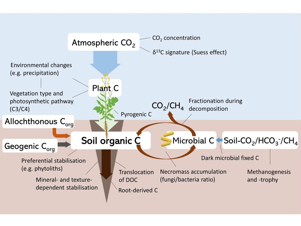 Die ẟ13C-Signaturen des organischen Kohlenstoffs in Böden sind wichtige Indikatoren für C-Flüsse und Umwandlungsprozesse im Boden. Tiefengradienten von ẟ13C können als ihr Archiv betrachtet werden. Allerdings wirken sich viele verschiedene Faktoren und Prozesse gleichzeitig auf die ẟ13C-Signaturen von Bodenkohlenstoff aus und erschweren so ihre Interpretation. In dieser neuen Übersichtsarbeit wird den Stand des Wissens über Einflussfaktoren, Prozesse und C-Quellen zusammen, die die ẟ13C-Signaturen der Bodenkohlenstoffs entlang von Profilen bestimmen. Externe Faktoren wie klimatische und atmosphärische Veränderungen wirken sich auf die ẟ13C-Signatur von C-Einträgen aus und haben im Vergleich zu bodeninternen Prozessen einen stärkeren und zunehmenden Einfluss auf ẟ13C-Gradienten in Bodenprofilen.