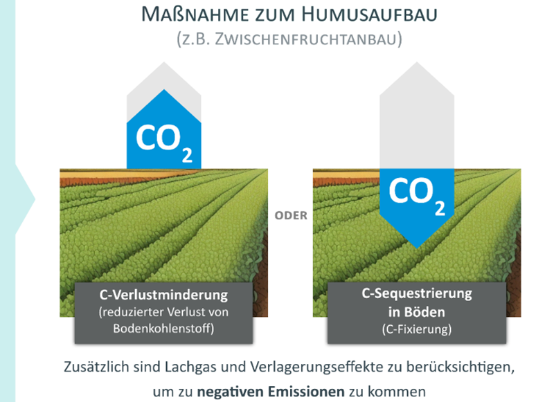 Emissionen, die bereits ausgestoßen wurden und nun in der Atmosphäre sind können wieder eingefangen und in Form von Humus im Boden klimaunschädlich gespeichert werden, was zu sogenannten negativen Emissionen führen kann. Das ist zumindest das Versprechen von Humusaufbau für den Klimaschutz. Wenn Kohlenstoff aus der Atmosphäre entfernt wird und z.B. im Boden als Teil des Humus gespeichert wird, spricht man von C-Sequestrierung im Boden. Es muss also zusätzlicher Humus gespeichert werden und nicht nur bestehende Vorräte erhalten werden. Doch da geht es schon los mit der Nutzung des korrekten Begriffs: Viele Äcker in Europa verlieren derzeit Bodenkohlenstoff wegen des Klimawandels oder durch nicht nachhaltige Bewirtschaftung. Viele Maßnahmen zum Humusaufbau werden deshalb auf diesen Flächen erst einmal nur den Kohlenstoffverlust reduzieren oder noch besser, stoppen. Dies führt zu keiner C-Sequestrierung im Boden, da es nur eine Reduzierung der Bodenkohlenstoffverluste ist (C loss mitigation). Hier können also keine negativen Emissionen generiert werden, da es immer noch mehr Emissionen gibt als Emissionen als Humus gebunden werden. Trotzdem ist es Klimaschutz, wenn die Emissionen im Vergleich zu vorher reduziert wurden.