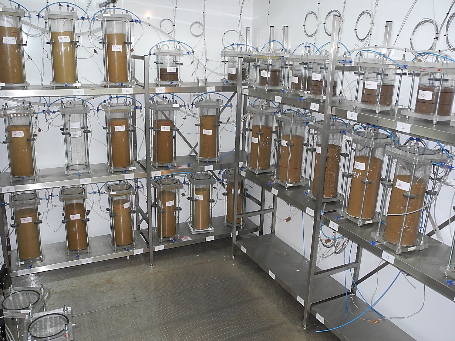 - Spülung der Bodensäulen (Bild 1) mit verschiedenen Gasgemischen: Luft, synthetische Luft, He/O2/N2-Gemische, aerob und anaerob, Dosierung von Spurengasen