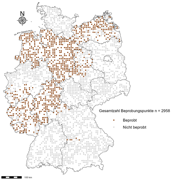Seit Anfang 2023 werden die Standorte der Bodenzustandserhebung Landwirtschaft (BZE-LW) wieder angefahren, beprobt und auf Änderungen in zentralen Bodeneigenschaften analysiert. Im Frühjahr 2025 wird der 1000ste Punkt wiederbeprobt. In einigen Bundesländer, wie Niedersachsen, Rheinland-Pfalz, Saarland und Hessen, wurden die Feldarbeiten bereits fast vollständig abgeschlossen. In Mecklenburg-Vorpommern, Bayern, Nordrhein-Westfalen und Sachsen-Anhalt sind die Beprobungen im vollen Gange. Ende 2025 wird es einen ersten Zwischenbericht geben und bis Ende 2029 soll die zweite bundesweite Beprobungskampagne der BZE-LW abgeschlossen sein.