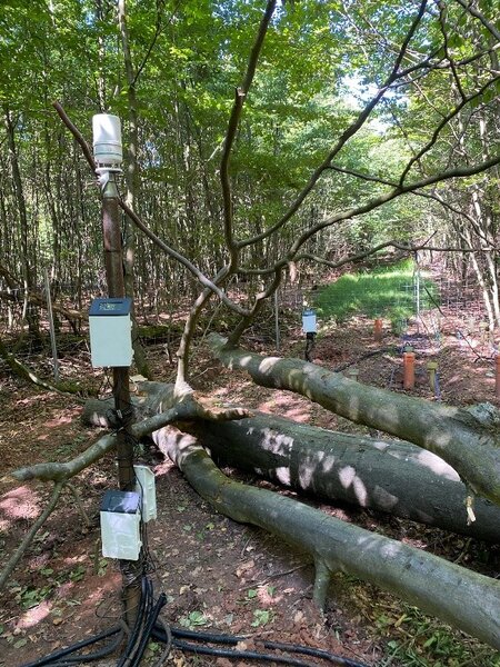 Unsere Untersuchungen haben aber auch gezeigt: Nicht alles ist planbar und manchmal erwarten einen kleine oder große Überraschungen beim Besuch der Versuchsflächen. So ist beispielsweise im Sturm eine große Buche in diese gestürzt. Glücklicherweise ist der Baum aber in die einzig freie Fläche gefallen, in der keine Sensorik installiert war, sodass kein nennenswerter Schaden entstanden ist. Lediglich der Zaun musste neu aufgerichtet werden.