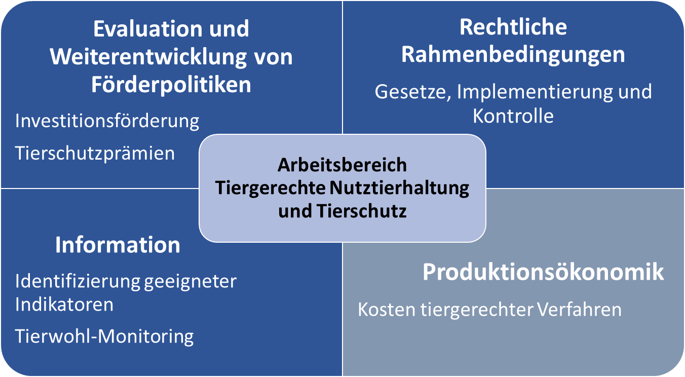 Um die Politik bei der Gestaltung von Förderinstrumente zu unterstützen, evaluieren wir die Wirkungen bestehender Maßnahmen, entwickeln aber auch Konzepte für neue Ansätze wie bspw. die ergebnisorientierte Tierwohlprämie. Zudem berechnen wir die Kosten, die auf einzelbetrieblicher Ebene mit der Einführung verschiedener Verfahren verbunden sind (z. B. Alternativen zur betäubungslosen Kastration, Haltungsverfahren mit Auslauf etc.) und ermitteln auf der Basis dieser Kosten die benötigten Mittel für entsprechende Fördermaßnahmen.