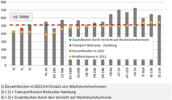 In unserer Studie gehen wir davon aus, dass auch unter einem Handelsabkommen nur Rindfleisch in die EU-gelangt, das ohne Wachstumsförderer wie Hormone und Beta-Agonisten produziert wurde. Wir haben dementsprechend den Kosteneffekt errechnet, den ein Verzicht auf diese Substanzen für ein Feedlot mit einer Jahresproduktion von 75.000 Rindern in den USA hätte. Ohne Wachstumsförderer sinken die Futteraufnahme, die Futterverwertung, die täglichen Zunahmen und die Ausschlachtung. Insgesamt führt dies zu Kostensteigerungen von rund 10 %. Hinzu kommen die Transportkosten von den USA nach Europa. Abbildung 1 zeigt das Ergebnis dieser Berechnungen für das Jahr 2012. Es zeigt sich, dass unter Berücksichtigung der oben genannten Kostenänderungen die US-Kosten nahe oder über den meisten Preisen (und teilweise Kosten) der untersuchten EU-Betriebe lägen. Demnach dürfte kaum ein wirtschaftlicher Anreiz bestehen, Rindfleisch in größeren Mengen nach Europe zu exportieren.
