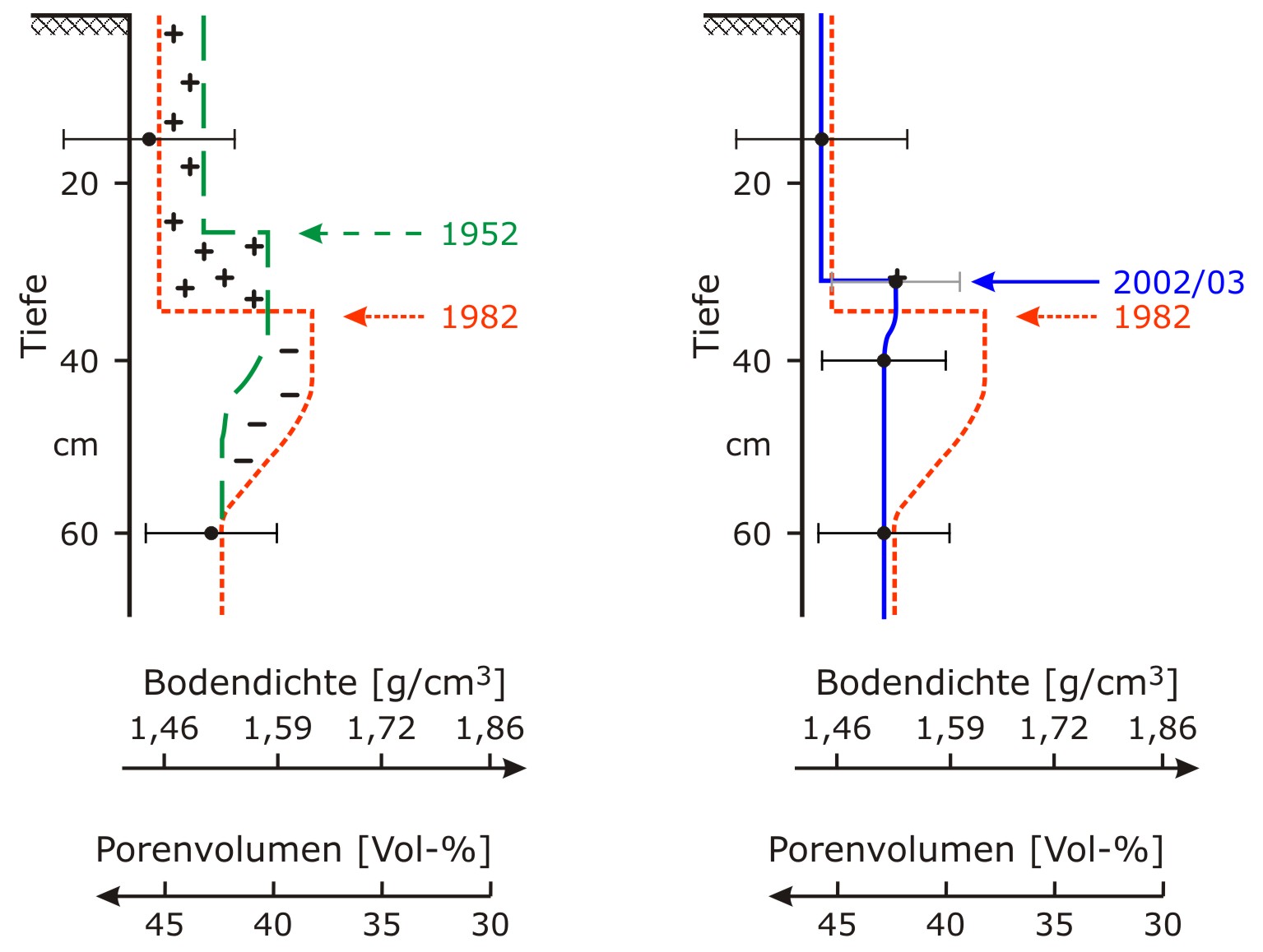 Durch kontinuierliche Forschung zur Bodenstruktur über Jahrzehnte haben wir regional eine gute Kenntnis über den tatsächlichen Verdichtungszustand von Böden. Durch die Entwicklung von Messtechnik im Boden (hydrostatische Setzungsmessung) und an der Maschine (Ultraschallsensor an der Felge) gelingt es, dynamische Prozesse bei der Interaktion Maschine/ Boden abzubilden: Dadurch können in situ Fragen beantwortet werden, wie z.B.: Hinterlässt eine Mechanisierungskette (z.B. Silomaishäcksler – Mulcher – Häckselgutwagen) eine elastische oder plastische Verformung des Bodens.