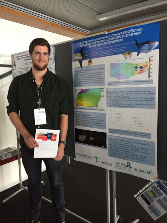 Auf der YOUMARES-Konferenz in Hamburg wurde Herr Alexander Knorrn mit dem Preis für das beste Poster ausgezeichnet. Er stellte die Ergebnisse seiner Bachelor-Arbeit über die Larvenentwicklung von Mondfischen vor, die er am Thünen-Institut für Fischereiökologie durchgeführt hatte.