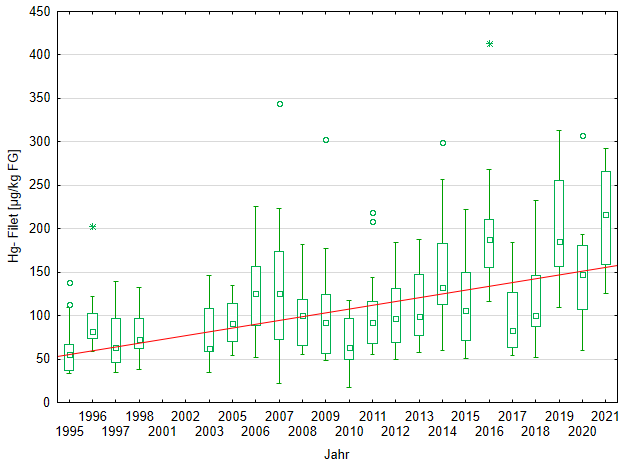 Die Quecksilber (Hg) -Gehalte in der Plattfischart „Kliesche“ zeigen über die letzten 30 Jahre einen ansteigenden Trend.