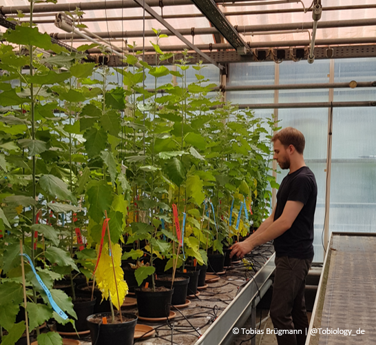 Auf dem Pflanztisch befinden sich 72 zu beprobende Pappeln. Diese sind in 3 Gruppen und zwei Behandlungen unterteilt und über die Fläche randomisiert aufgestellt. Für den Ausschluss von Mikroklimaten wechseln sich die Behandlungen Stress und Kontrolle stets über den Pflanztisch ab. Die Kontrollgruppe wird über ein automatisches Bewässerungssystem bewässert und bekommt täglich ca. 80 ml Wasser. Die Stressgruppe bekommt gar kein Wasser mehr. Am Rand des Pflanztischs befinden sich Randpflanzen. Diese gehören nicht zu dem Experiment und haben den Sinn die äußere Reihe der experimentellen Pflanzen von Randeffekten abzuhalten (andere klimatische Bedingungen), die die Ergebnisse verfälschen könnten. Die Pflanzen werden künstlich beleuchtet (16/8).