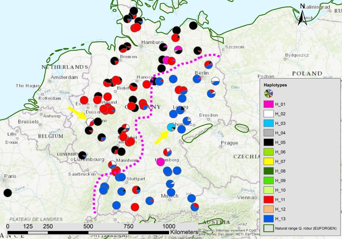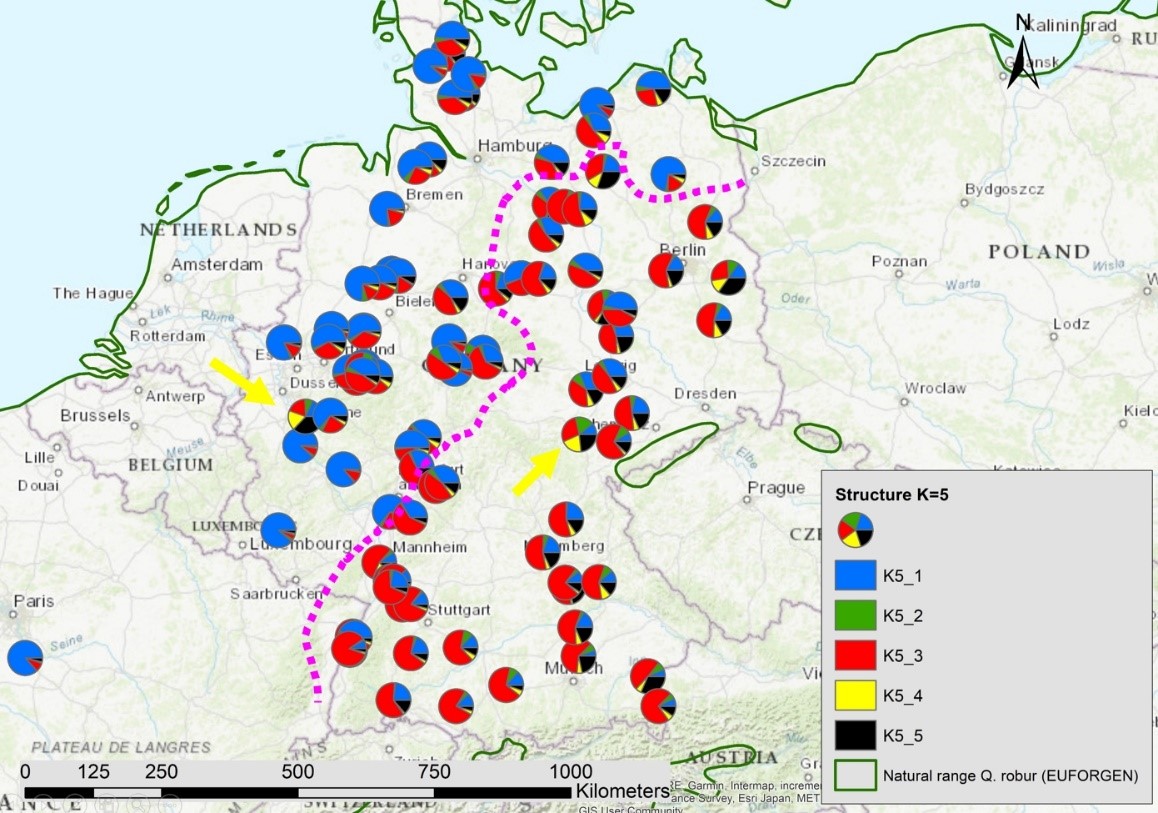 Die Untersuchung an 381 variablen Genbereichen des Zellkerns und der Plastiden der Eichen zeigte ein ausgeprägtes räumliches Muster (Abbildung 1). Die heutige genetische Zusammensetzung der Stieleichen in Europa ist das Ergebnis der Rückwanderung aus eizeitlichen Refugialgebieten, Genfluss via Pollen und der Hybridisierung mit der Traubeneiche. Die Auswirkungen der künstlichen Verjüngung von Beständen durch ortsfremdes Vermehrungsgut sind sichtbar, verändern das Gesamtbild jedoch nur wenig. In Deutschland ist eine Zweiteilung auffällig: Die Stieleichen aus West- und Norddeutschland unterscheiden sich genetisch deutlich von den Stieleichen in Süd- und Ostdeutschland (Abbildung 2). Hierfür sind unterschiedliche eiszeitliche Rückwanderungsrouten und ein stärkerer Anteil des Traubeneichengenoms bei den Stieleichen in Nord- und Westdeutschland verantwortlich.