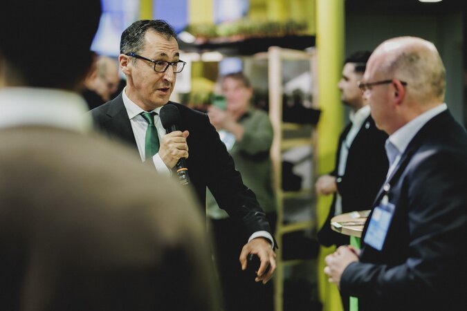 Minister Cem Özdemir im Gespräch mit dem Institutsleiter Dr. Bernd Degen, der die aktuelle Forschung des Institutes präsentiert.