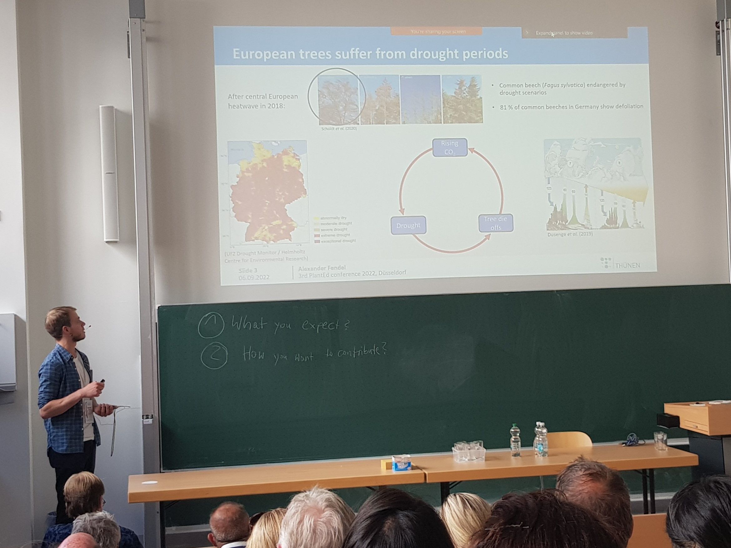 Alexander Fendel hielt einen Vortrag über die Analyse der Trockenstresstoleranz von Pappeln, in denen bestimmte Gene modifiziert wurden. Dadurch lassen sich Rückschlüsse auf die Bedeutung dieser Gene für die Klimawandelanpassung von Bäumen gewinnen. Auf der Tagung tauschten sich Alexander und Kolleg:innen insbesondere über das sogenannte Phenotyping aus, also wie die Bäume im Gewächshaus untersucht werden, welche Parameter erhoben werden und wie diese Daten zu interpretieren sind.