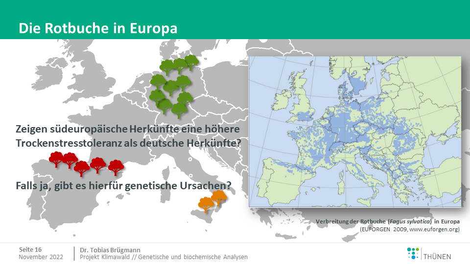 Rotbuchen haben ein großes Verbreitungsgebiet, an dessen südlichem Rand sie mit anderen klimatischen Bedingungen konfrontiert sind als in Deutschland: Die Jahresdurchschnittstemperatur liegt über den deutschen Werten; die Niederschlagsmenge ist geringer als in Deutschland. Zur Untersuchung der unterschiedlichen Trockenstresstoleranz von Buchenherkünften wurde in Berlin ein Herkunftsversuch ("Klimawald") angelegt, in dem einzelne Versuchsglieder (eine Gruppe von Bäumen) bewässert werden können, während andere Versuchsglieder im Sommer vom (natürlicherweise eintretenden) Trockenstress beeinflusst werden. Im Sommer 2022 wurde ein Trockenstressversuch mit jeweils einer Herkunft aus Deutschland, Frankreich, Italien und Spanien initiiert. Dabei wurden nach unterschiedlichen Stressintensitäten ökophysiologische, biochemische und genetische Analysen durchgeführt. Mit den Daten soll die Trockenstresstoleranz einzelner Rotbuchen-Herkünfte abgeschätzt werden.