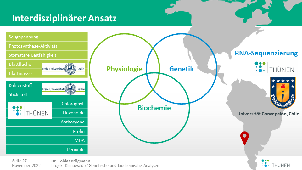 Die genetischen Regulierungen werden mittels Transkriptomanalyse untersucht. Dazu werden alle mRNA-Moleküle, die in den Blättern gebildet werden, entschlüsselt. Auf biochemischer Ebene werden u.a. die Gehalte der Trockenstressmarker Prolin, Malondialdehyd (MDA) und Peroxid gemessen. Zusammen mit den physiologischen Daten wie der Photosyntheseaktivität, der stomatären Leitfähigkeit und dem Wasserpotenzial soll der analytische Dreiklang ein umfassendes Bild der Trockenstresstoleranz ergeben.