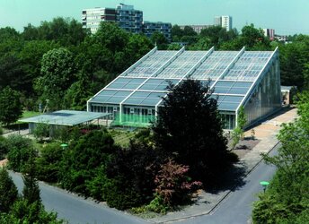 Die Gewächshausanlage (ca. 700 m2, 14 m Oberhöhe) ist in drei Klimazonen unterteilt: ‚mediterran‘, ‚tropisch wechselfeucht‘ und ‚tropisch immerfeucht‘. Sie beherbergt etwa 500 Baumarten der Tropen und Subtropen Afrikas, Asiens und Zentralamerikas. Neben Nutzpflanzen wie Papaya, Kakao, Kaffee und Bambus, stellt die europaweit größte Sammlung „lebender“ tropischer Holzarten das Kernstück dar.