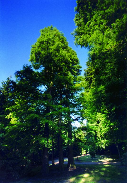 Sumpfzypressen (Taxodium distichum) im Alter von rund 70 Jahren, beheimatet in den südöstlichen USA, gehören mit ihrem extrem dauerhaften Kernholz ebenso zu den vielen Attraktionen wie eine Gruppe „lebender Fossile“, die Urweltmammutbäume (Metasequoia glyptostroboides). Diese sommergrüne Koniferenart galt bis zu ihrer Wiederentdeckung im Jahre 1941 in einer unzugänglichen Bergregion Chinas als ausgestorben, und es existierten bis dahin nur Fossilfunde. Auch die Borstenkiefern (Pinus longaeva) sind bemerkenswert: Am Naturstandort in den Hochlagen Colorados erreichen sie ein Alter von mehr als 4.600 Jahren. Sie ermöglichte zudem Geophysikern sensationelle Befunde zu den wechselnden Kohlendioxidgehalten der Atmosphäre in diesem durch die Jahresringe erfassbaren Zeitrahmen.