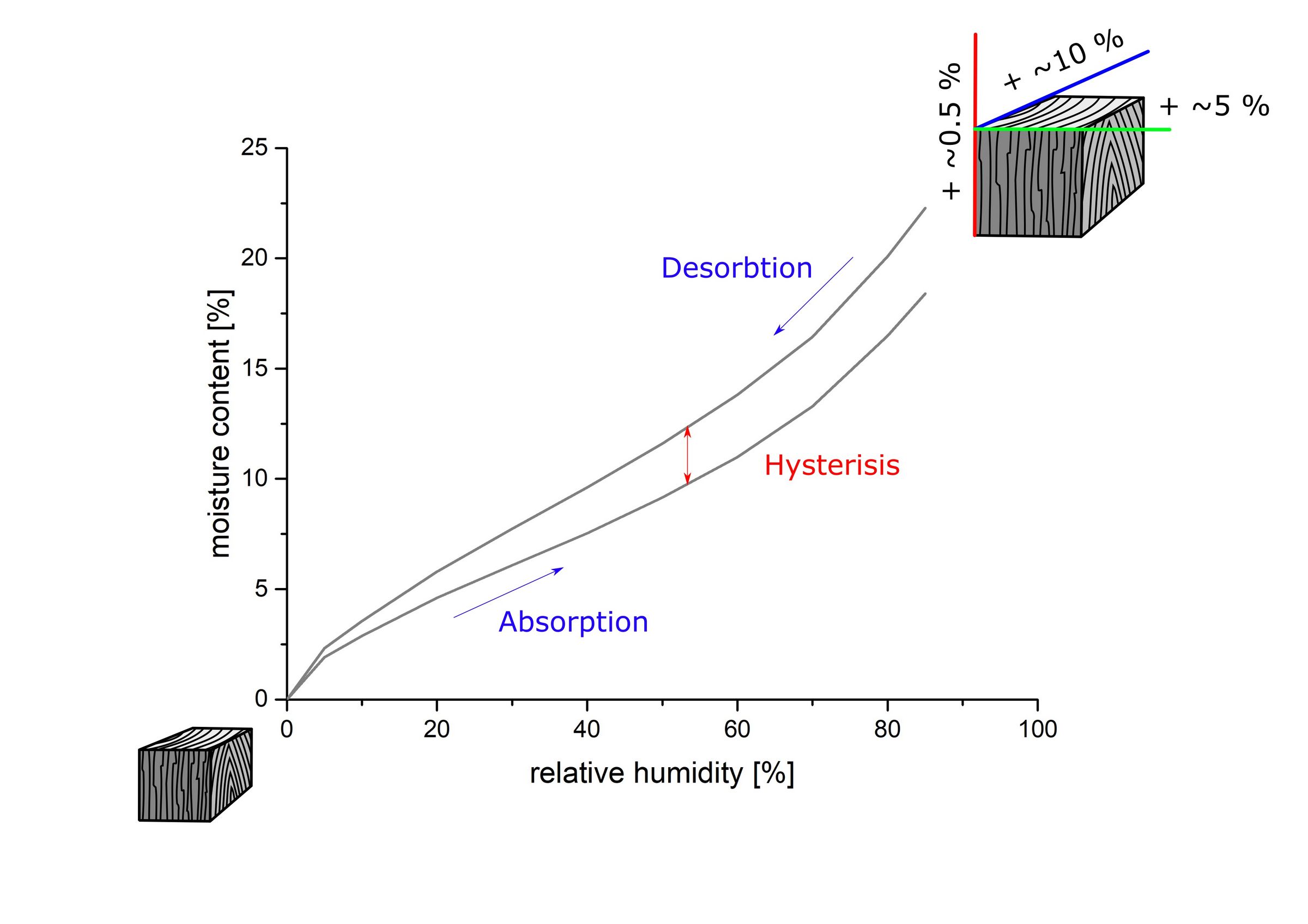 Holz ist ein hygroskopisches Material. Es kann Wasserdampf aus der Luft (Luftfeuchtigkeit) aufnehmen oder wieder abgeben und gleicht so seine Materialfeuchte an die Umgebungsbedingungen an. Aber auch flüssiges Wasser (z.B. durch Regen im Außenbereich) kann von Holz aufgenommen werden. Durch diese Feuchtigkeitsänderung verändert sich das Volumen des Holzes - es kommt zum Quellen und Schwinden. Auch die technischen Eigenschaften werden durch die Holzfeuchtigkeit verändert. So sinkt z.B. die Biegefestigkeit mit ansteigender Holzfeuchtigkeit.