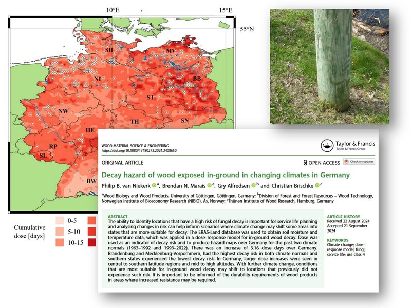 Die Fähigkeit, Orte zu identifizieren, an denen ein hohes Risiko für Pilzbefall besteht, ist wichtig für die Planung der Gebrauchsdauer von Holzkonstruktionen, und die Analyse von Risikoänderungen kann dabei helfen, Regionen zu identifizieren, in denen der Klimawandel Bedingungen schafft, die für Fäulnis besser geeignet sind. In dieser Studie wurde die ERA5-Land-Datenbank verwendet, um Daten zur Bodenfeuchtigkeit und -temperatur zu erhalten, die wiederum in ein Dosis-Wirkungs-Modell für den pilzlichen Holzabbau im Boden eingespeist wurden. Die Dosis wurde zur Erstellung von Gefährdungskarten für Deutschland für die letzten beiden Klimanormale (1963–1992 und 1993–2022) verwendet. Der Vergleich zeigt, dass in Deutschland größere Dosiserhöhungen in Regionen mittlerer bis südlicher Breite sowie in mittleren bis hohen Lagen stattgefunden haben. Mit dem weiteren Klimawandel könnten sich die Bedingungen, die für Fäulepilze im Boden am besten geeignet sind, an Standorte verlagern, an denen bisher kein solches Risiko bestand. Die Anforderungen an die Dauerhaftigkeit von Holz unterliegen auch zukünftig Änderungen und sind bei der Verwendung von Holz im Außenberich zu berücksichtigen.