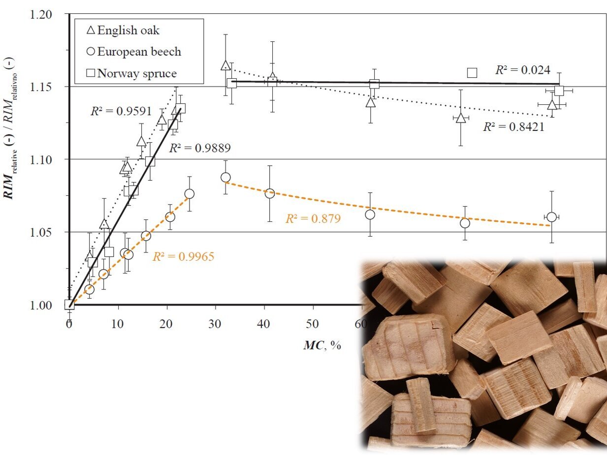 Die meisten mechanischen Holzeigenschaften werden durch die Holzfeuchte im hygroskopischen Bereich negativ beeinflusst, wenn man die Spannungsrelaxation von Holz bei sehr niedrigen Feuchtigkeitsgehalten (MC) außer Acht lässt. Im Gegensatz dazu scheint die strukturelle Integrität und damit die Sprödigkeit von Holz durch Feuchtigkeit positiv beeinflusst zu werden. Ziel dieser Studie war es, die Wirkung von der Holzfeuchte auf die strukturelle Integrität von Holz zwischen darrtrockenem Zustand und Holzfeuchten weit über der Zellwandsättigung, d. h. bei ca. 100 % zu untersuchen. Der aus HEMI-Tests (High-Energy Multiple Impact) stammende ‚Resistance to Impact Milling (RIM)‘ nahm mit steigender Feuchte im hygroskopischen Bereich zu, was durch Spannungsrelaxation und „Klebeffekte“ innerhalb der Zellwand-Polymerstruktur erklärt werden könnte, die aus einem wachsenden Netzwerk von Wasserstoffbrückenbindungen auf Zellwandebene resultieren könnte.