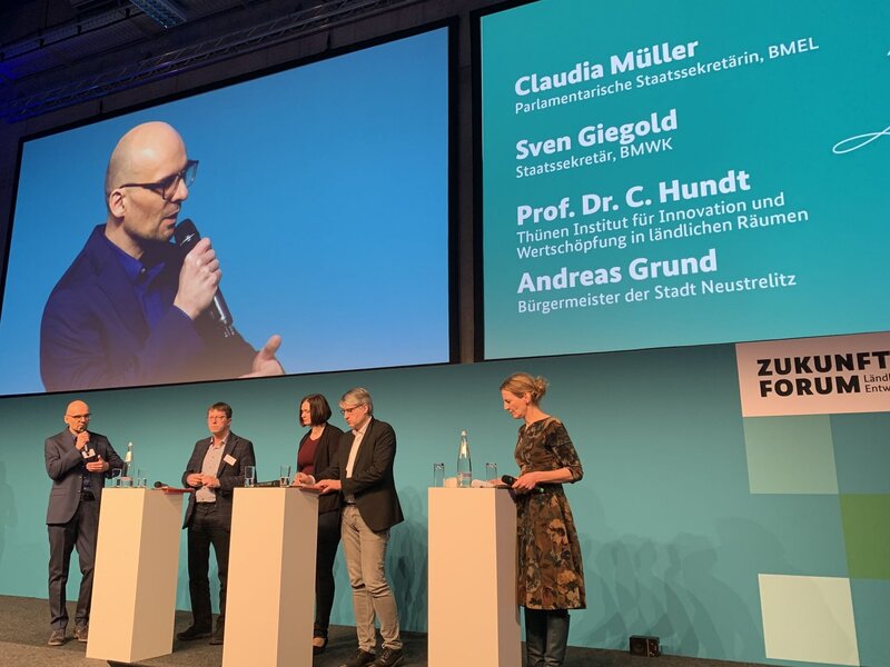 In der Abschlussveranstaltung des Zukunftsforums diskutierte Christian Hundt mit Claudia Müller (Parlamentarische Staatssekretärin beim Bundesminister für Ernährung und Landwirtschaft), Sven Giegold (Staatssekretär im Bundesministerium für Wirtschaft und Klimaschutz) sowie Andreas Grund (Bürgermeister der Stadt Neustrelitz) zum Generalthema „Regionale Wertschöpfung in ländlichen Räumen“.