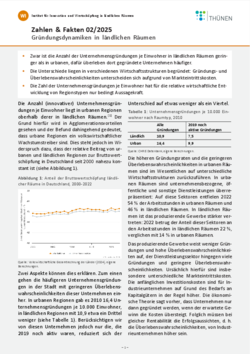 Simmler M, Garcia Dominguez I (2025) Gründungsdynamiken in ländlichen Räumen. Zahlen & Fakten zur Wirtschaft in ländlichen Räumen 02/2025. Thünen-Institut für Innovation und Wertschöpfung in ländlichen Räumen. DOI:10.3220/253-2025-65