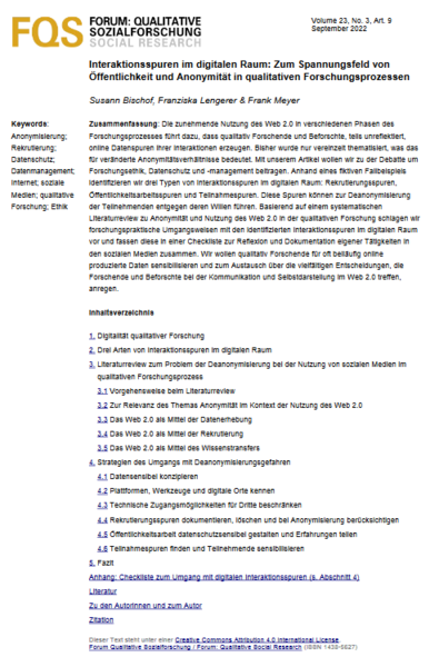 Mit zunehmender Nutzung des Internets in verschiedenen Phasen des Forschungsprozesses entstehen Datenspuren, deren sich qualitativ Forschende und Beforschte häufig nicht bewusst sind. Der Artikel will zur Debatte um Forschungsethik, Datenschutz und -management beitragen und Forschende für das Thema der Anonymität im Zeitalter des Internet sensibilisieren.