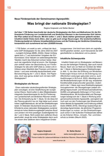 Neue Förderperiode der Gemeinsamen Agrarpolitik (GAP): Auf über 1.700 Seiten beschreibt der deutsche Strategieplan die Ziele und Maßnahmen für die EU finanzierte Förderung von Landwirtschaft und ländlichen Räumen in den kommenden fünf Jahren. Regina Grajewski und Dr. Stefan Becker haben in einer aktuellen Veröffentlichung der Zeitschrift „Ländlicher Raum“ das Wichtigste auf vier Seiten zusammengefasst. Der Strategieplan selbst ist ein Novum. Mit ihm sollen 1. und 2. Säule der GAP stärker gemeinsam gedacht werden. Inhaltlich bleibt Vieles beim Alten, aber es gibt auch einige Veränderungen: Die landwirtschaftliche Förderung besitzt ein höheres Umweltambitionsniveau und die Förderung der ländlichen Entwicklung konzentriert sich zunehmend auf den LEADER-Ansatz.