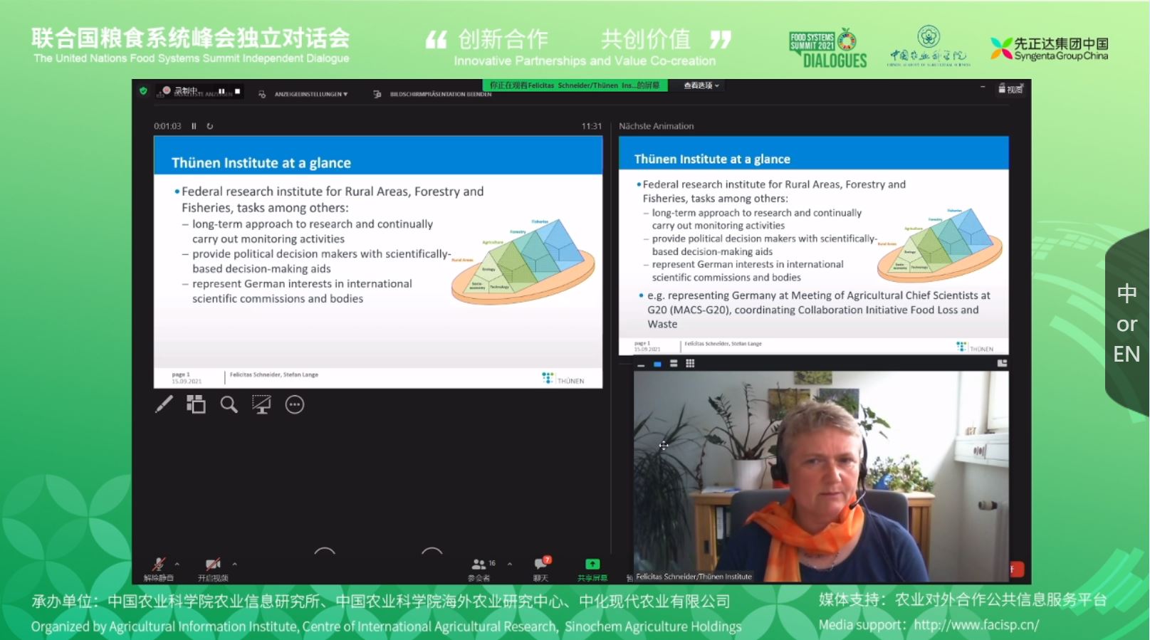 Unser langjähriger Kooperationspartner, Prof. Xiangping Jia von der Chinesischen Akademie für Agrarforschung (CAAS), organisierte am 15. September gemeinsam mit Syngenta Group China einen „Independent Dialogue“ zum Thema „Innovative Partnerschaften und gemeinsame Wertschöpfung“. Ziel des Dialogs, den eine Vertreterin des Welternährungsprogramms moderiert wurde: die Initiative des UN-Ernährungsgipfels aktiv zu unterstützen, den öffentlichen und privaten Sektor sowie alle Interessengruppen in den Dialog einzubinden, Partnerschaften zu stärken und grenzüberschreitende Diskussionen und Maßnahmen zur Umgestaltung der Ernährungssysteme zu fördern. Diskutiert wurden die Themen „Transformation des Lebensmittelsystems“, „Lebensmittelverluste und -abfälle“ sowie „Digitale Innovationen und ihr Beitrag für Landwirtschaft, ländliche Räume und Landwirte“.