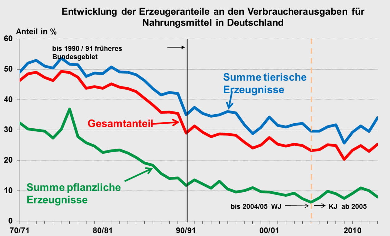 Seit den siebziger Jahren berechnet das Thünen-Institut für Marktanalyse in Braunschweig die Anteile landwirtschaftlicher Erzeugererlöse an den Verbraucherausgaben für Nahrungsmittel. Dabei werden die Erlöse für wesentliche landwirtschaftliche Produkte, die von der deutschen Landwirtschaft für Nahrungszwecke im Inland verkauft wurden, den Ausgaben der Verbraucher für die daraus hergestellten Nahrungsmittelmengen gegenübergestellt. Die Berechnungen werden für die sechs Produktgruppen Brot, Kartoffeln, Zucker sowie Fleisch/Fleischwaren, Milch/Milcherzeugnisse und Eier durchgeführt. Die Berechnungen repräsentierten 2012 etwa 50 % der gesamten Erzeugererlöse. Nicht erfasst sind insbesondere Futtergetreide, Gartenbauerzeugnisse und Wein.