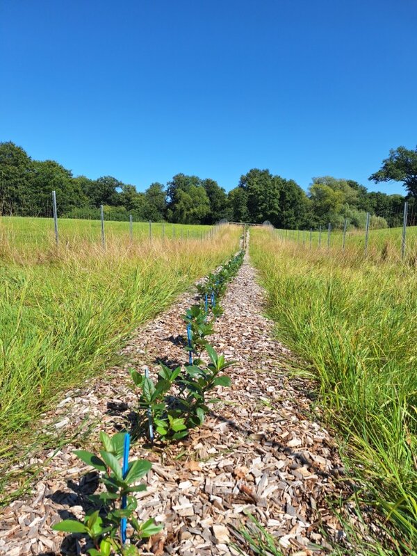 Den Start machte eine öffentliche Pflanzaktion im Mai 2024, bei der 26 Freiwillige an einem Tag 650 m Hecke pflanzten. Sie wird verschiedenste Früchte für den menschlichen Verzehr tragen und wird später als Selbstpflückhecke genutzt. Diese Fruchthecke haben wir im Herbst des gleichen Jahres nochmals um 330 m verlängert. In drei Streifen stehen jetzt z.B. Esskastanien, Holunder, Felsenbirne, Aroniabeere, Johannisbeere, Ölweide und Mostbirne. Derzeit erproben wir darin unterschiedliche Verfahren zum Schutz von Wildverbiss und zur Verminderung des Jäteaufwandes.