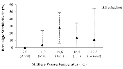 Insgesamt variierte die bereinigte Sterblichkeitsrate für die geangelten Dorsche zwischen 0,0 % und 27,3 % (Mittelwert mit Standardfehler: 11,2 % ± 22,0 %). Etwa 85 % der toten Fische starben innerhalb der ersten 24 Stunden nach dem Fangprozess. Mit Hilfe einer multiplen logistischen Regression konnte das Vorhandensein von Wundblutungen und eine Erhöhung der Wassertemperatur als Einflussvariablen ermittelt werden, welche die Sterblichkeit signifikant erhöhen. Zusätzlich wurde bei einigen überlebenden Dorschen eine langsame Heilung der Hakenwunden (> 10 Tage) und die Entwicklung von bakteriellen Wundinfektionen beobachtet.