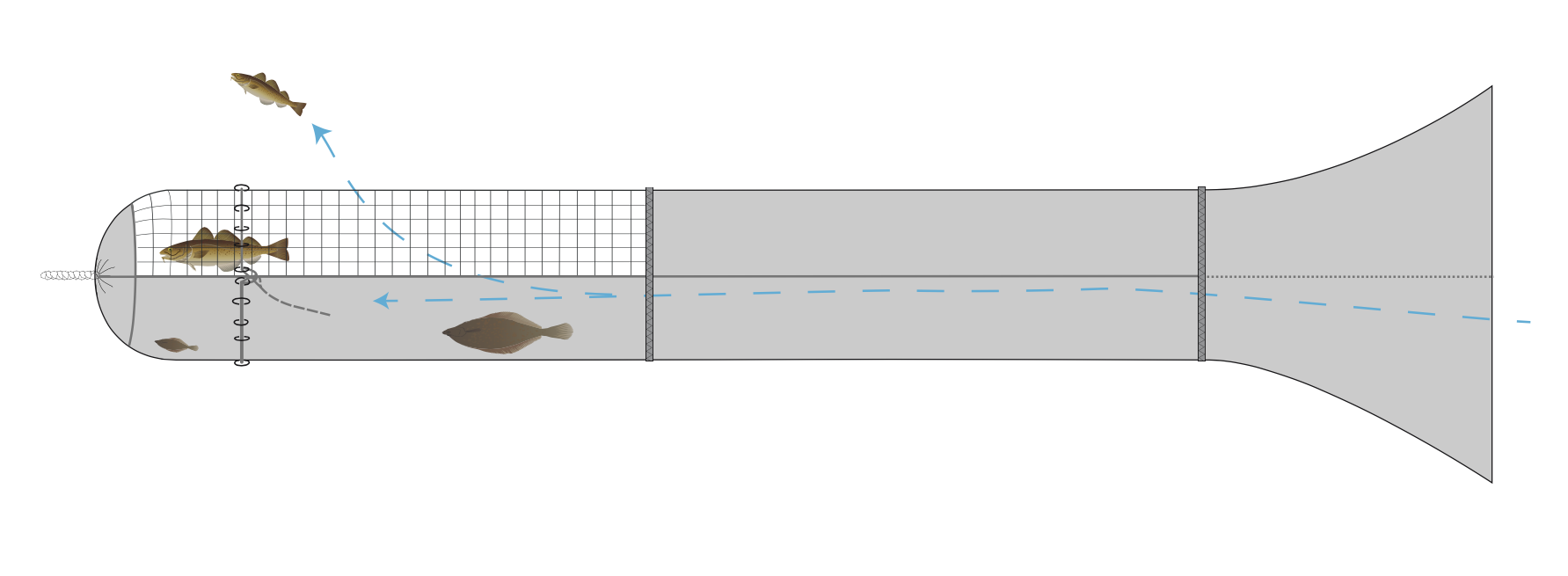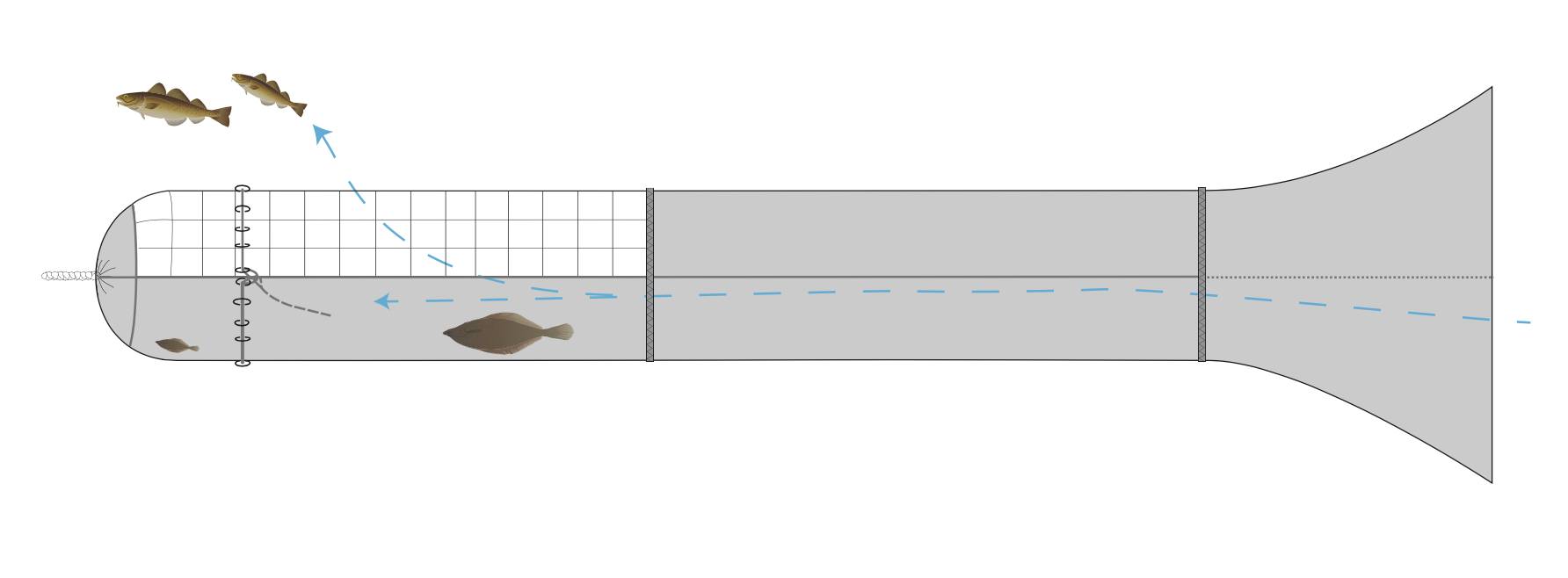 Abbildung unten: Kleine Rundfische können durch das BACOMA-Fenster entkommen. Große Rundfische und Plattfische passen nicht durch die Maschen und werden gefangen.