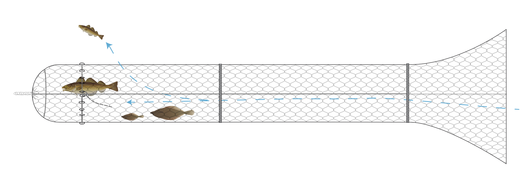 Abbildung unten: nahezu alle Größen von Rundfischen und kleinen Plattfischen können entkommen, große Plattfische werden gefangen.