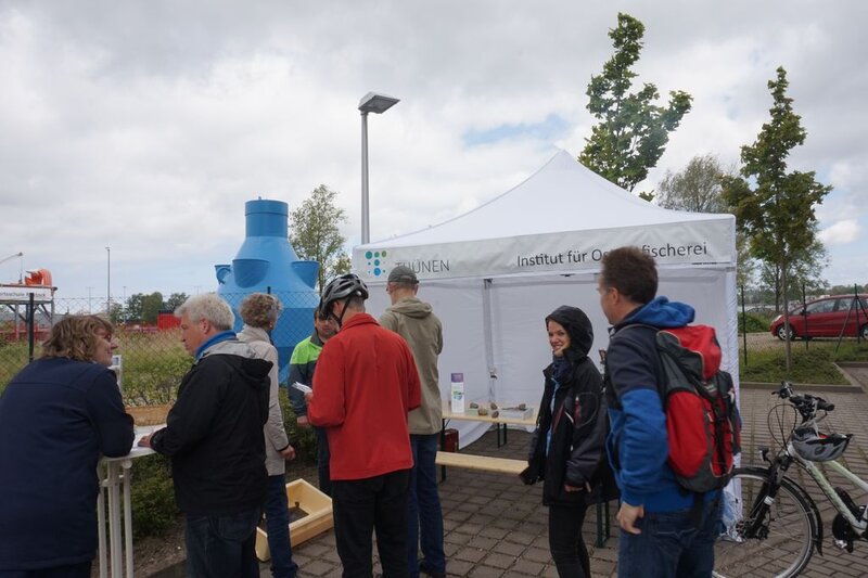 Inzwischen sind zehn "Wissensbojen" in ganz Rostock aufgestellt. Auch vor dem Thünen-Institut für Ostseefischerei steht eine der blauen Bojen.
