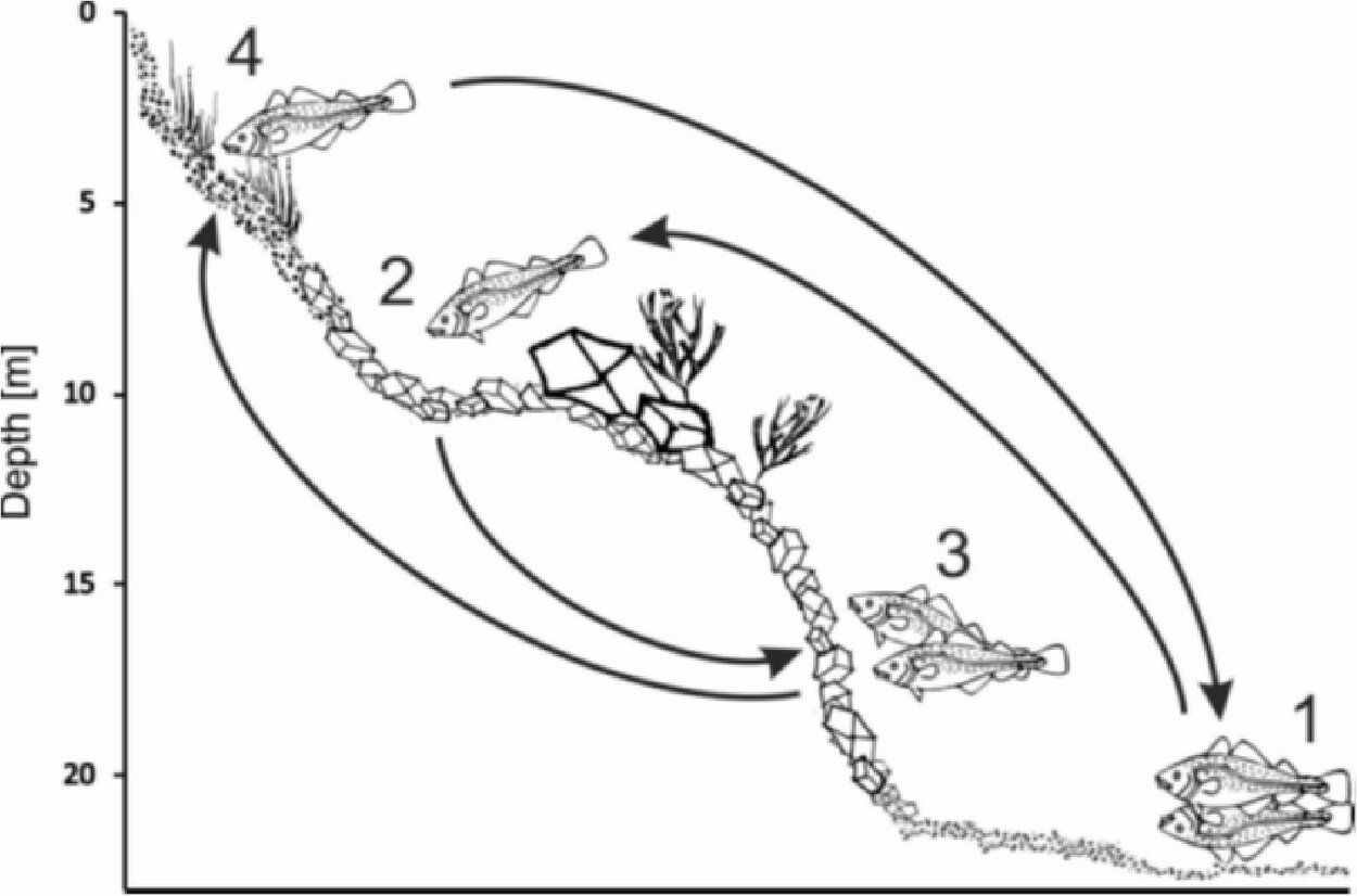 1) Das ökologische Wissen lokaler Stellnetzfischer aus Schleswig-Holstein und Daten aus der Beprobung kommerzieller Fischereifahrzeuge wurde genutzt, um monatliche Verteilungsmuster von Dorschen sowie die saisonalen Habitat-Präferenzen im Detail zu untersuchen. Die Ergebnisse zeigen, dass die Dorsche nur zur Laichzeit und in der Hochsommerphase tiefere Gebiete nutzen, ansonsten aber die flachen Küstengewässer bewohnen und dort vor allem bewachsenen Hartboden, steinige Riffstrukturen, Muschelfelder und Seegraswiesen bevorzugen. Die Fischereiforschungsreisen erfassen also nur die Teile der Dorschpopulation, die die tieferen Bereiche der westlichen Ostsee nutzen. Wenn sich der Anteil der Dorsche im Flachwasser über die Jahre aber verändert hat, erhöht dies die Unsicherheit der Bestandsberechnung.