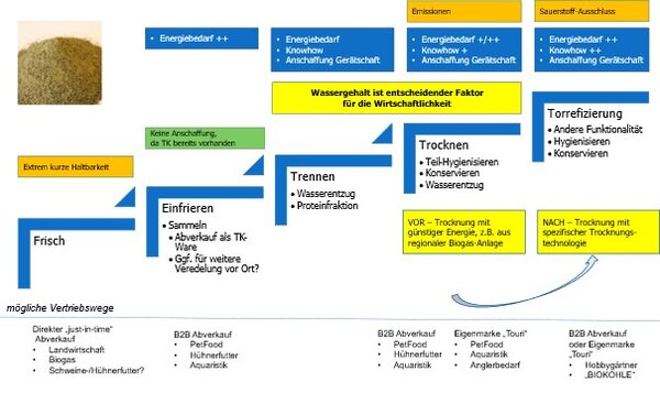 Aufgrund der vermutlich verfügbaren Mengen, den nötigen Verarbeitungsschritten sowie Marktpotenzialen erscheint die regionale Verwertung der Schälreste in Form von Nischenprodukten am vielversprechendsten. Futterzusatz für Haustiere und in der Hobby-Aquaristik oder als Bodenverbesser in der Hobby-Gärtnerei sind weitgediehene Vermarktungsideen. Hier können, je nach Verarbeitung der Schälreste, erhebliche Wertschöpfungen stattfinden; dies erfordert aber auch teilweise hohe einmalige und laufende Investitionen in Tiefkühllagerung und verschiedene Trocknungsverfahren oder andere Verarbeitungsschritte inkl. Gerätschaften. Eine Verwertung als Chitin oder Chitosan erscheint regional nicht wirtschaftlich möglich, da eine EU-basierte Herstellung durch „green extraction“-Verfahren zu teuer und unausgereift ist. Auch gibt es keinen eigenen Nischenmarkt für Produkte (Kosmetika, biomedizinische Produkt etc.) aus umweltfreundlichem oder „regionalem“ Chitin oder Chitosan.