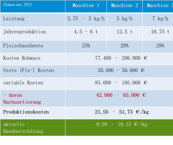 Es gibt bereits Entschälmaschinen, die das Garnelenfleisch mit Messern, Rollen, Walzen o.ä. aus ihrem Panzer holen. Diese Schälprinzipien beruhen auf einem mechanischen Prozess, in dem ein Maschinenbestandteil in Kontakt mit der Garnele kommt. Im direkten Vergleich dieser Techniken hat sich gezeigt, dass diese bis zu fünfmal teurer sind als das Pulen per Hand im außereuropäischen Raum. Hauptkostentreiber sind die oft sehr aufwendige Nachsortierung und Wartung bei diesen Maschinen. Zudem ist die Ausbeute geringer als bei Handentschälung. Beides hoffen wir mit dem kontaktlosen Prinzip verbessern zu können.