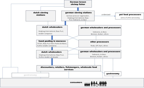 Unsere auf Interviews mit verschiedenen Akteuren beruhende Darstellung der momentanen Wertschöpfungskette der Nordseegarnele bestätigt, dass diese sehr unbalanciert und international organisiert ist. Der größte Teil der in Deutschland gefangenen Krabben wird von nur zwei holländischen Großhändlern aufgekauft und nach der durch sie organisierte Hand-Entschälung in Marokko an den Einzelhandel weiterverkauft. Dabei erzielen diese Großhändler im Vergleich zur Fischerei und Einzelhandel die höchsten Gewinnmargen.