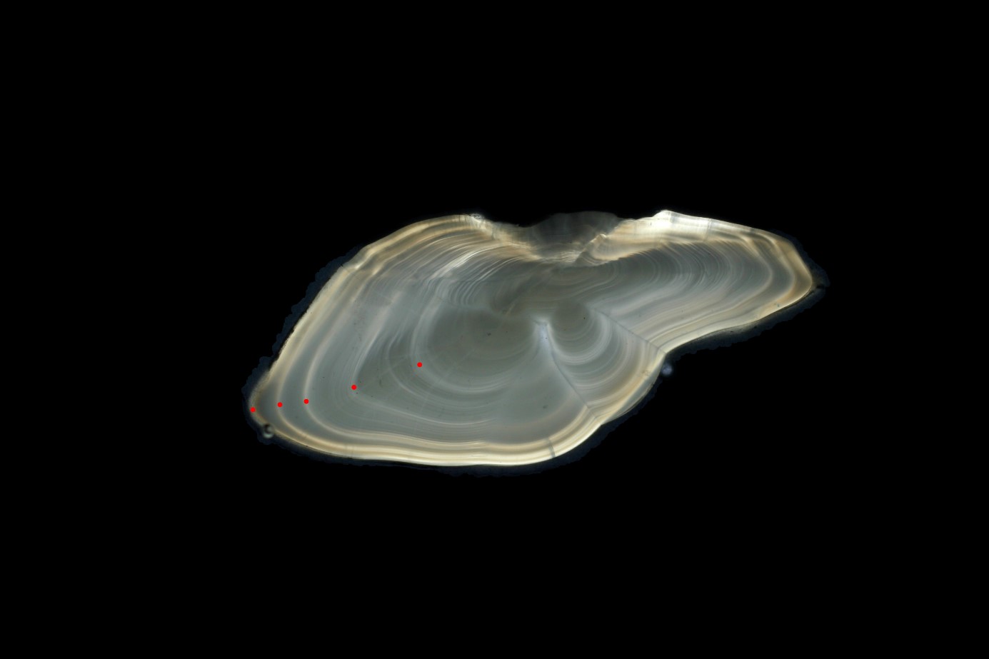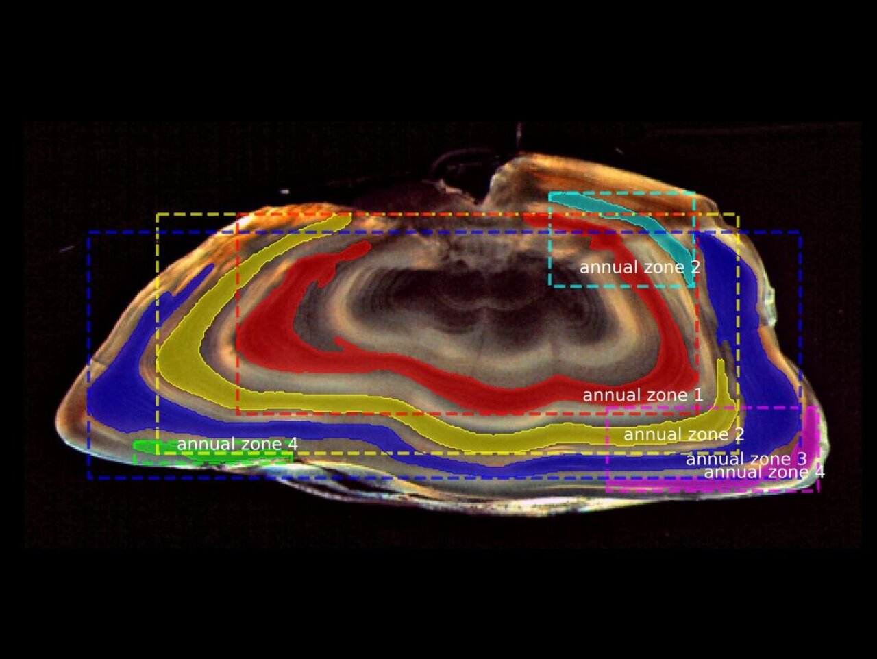 Zur Veranschaulichung des manuellen Altersleseprozesses zeigt die Abbildung 1 ein Bild eines Otolithen, bei dem das Alter auf fünf Jahre geschätzt wurde. Um die Methode genauer und weniger anfällig für subjektive Fehler zu machen, durchlaufen die Altersleserinnen und -leser jahrelange Schulungen mit dem Ziel, eine Über- oder Unterschätzung des Fischalters zu verhindern. Dies kann ansonsten nachteilige Auswirkungen auf die Bewirtschaftung der Fischbestände haben.