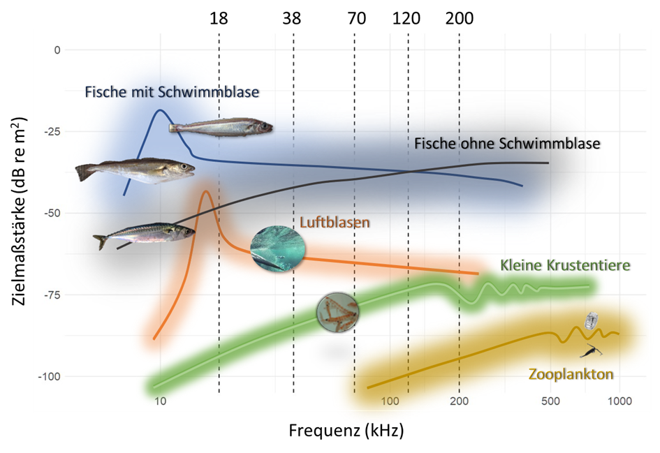 Jedes Objekt oder Lebewesen mit einer inneren Dichte und/oder inneren Schallgeschwindigkeit, die sich von der Dichte und der Schallgeschwindigkeit des umgebenden Mediums unterscheidet, besitzt eine charakteristische frequenzabhängige, akustische Signatur, d.h. ein charakteristisches „Echo“. Diese Signatur erlaubt es uns, akustische Signale in fischereibiologisch und ökologisch relevante Parameter umzurechnen. Die zurückgestrahlte Schallenergie (das Echo) wird mit der ausgesandten Schallenergie (vom Echolot) verglichen. Aus den beobachteten Unterschieden können dann mit einigen Einschränkungen Rückschlüsse auf die Art- und Größenzusammensetzung gezogen werden. So strahlt zum Beispiel ein Hering mit prall gefüllter Schwimmblase wesentlich mehr Schallenergie zurück als eine Makrele ohne Schwimmblase. Man muss sich hier vorstellen, dass sich die Dichte des Gases in der Schwimmblase sehr stark von der Dichte des umgebenden Mediums (Meerwasser) unterscheidet, während der Dichteunterschied zwischen Muskulatur und Skelett einer Makrele im Vergleich zum umgebenden Medium sehr viel geringer ist. Auch die Schallgeschwindigkeit ist sehr unterschiedlich: In der Luft beträgt sie ca. 300 m/s, was im Vergleich zu Meerwasser mit ca. 1.500 m/s oder der mittleren Schallgeschwindigkeit des Gewebes / Körpers einer Makrele von etwa 1.535 m/s sehr langsam ist.