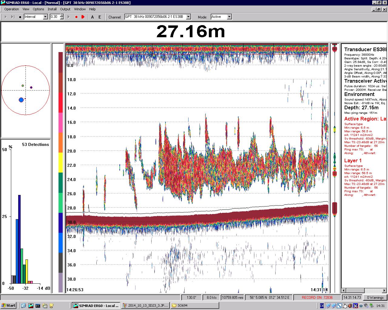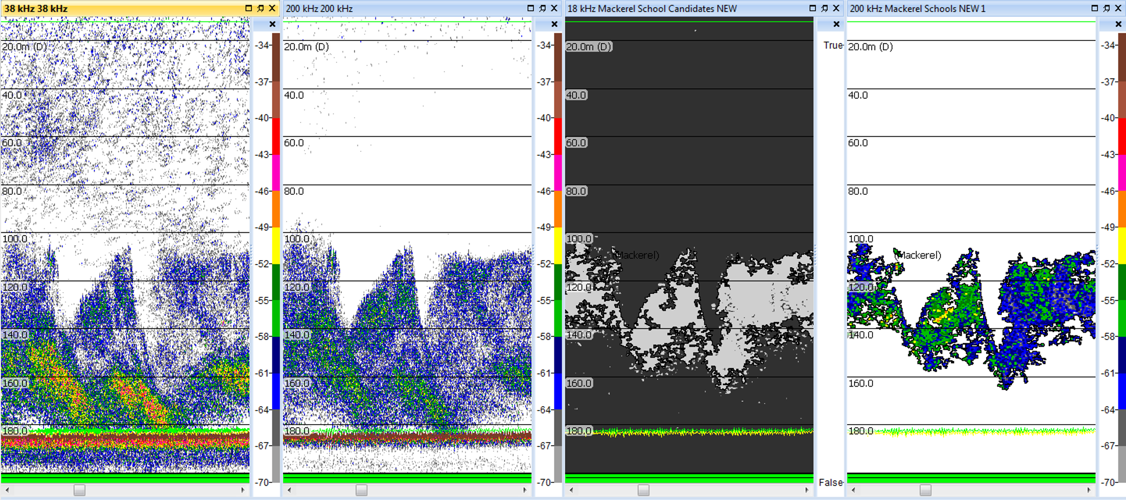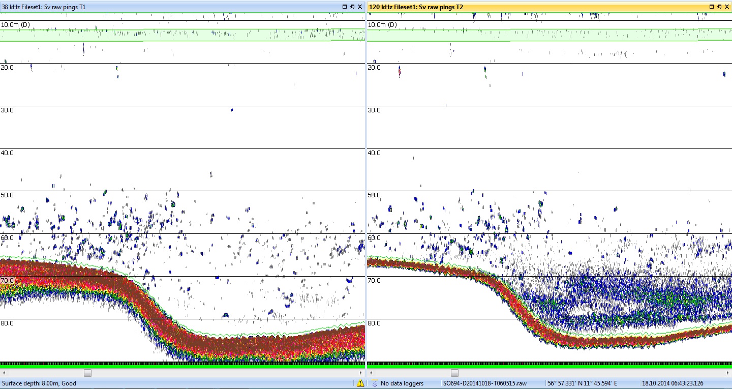 Die Klassifizierung von Echos – d.h. die Zuordnung von Echos zu bestimmten Organismengruppen – beruht auf den akustischen Eigenschaften der Organismen. Verschiedene Meerestiere erzeugen unterschiedliche Echosignaturen. Dies können nicht nur unterschiedliche Schwarmformen auf dem Echolotbildschirm sein, sondern vor allem auch die sogenannte „Frequency response“ - also eine typische Echosignatur bei verschiedenen Frequenzen. Auf unseren Surveys setzen wir Echolote mit mehreren Schwingern der Arbeitsfrequenzen 38, 70, 120 und 200 kHz ein.