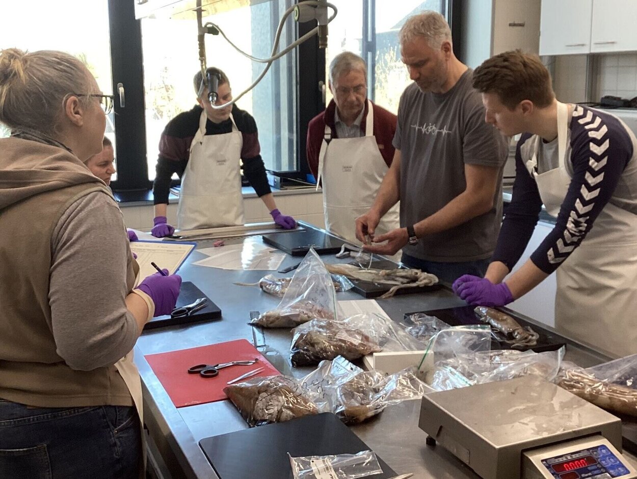 Aus diesem Grund wurde ein Thünen-interner Workshop zum Thema „Cephalopoden“ am Institut für Seefischerei in Bremerhaven vom 07. bis 09. April 2025 veranstaltet. Dozent für diesen Workshop war Dr. Daniel Oesterwind vom Thünen-Institut für Ostseefischerei, der sich unter anderem auf die Cephalopoden-Forschung spezialisiert hat. Im Rahmen dieses Workshops wurden die Teilnehmerinnen und Teilnehmer in die Thematik eingeführt, sie bekamen einen Überblick zum aktuellen Forschungsstand und wurden anschließend im Labor mit den relevanten Methoden und Konzepten der Artbestimmung vertraut gemacht.