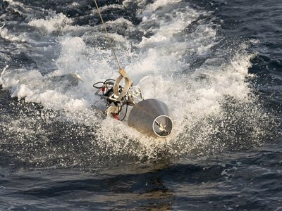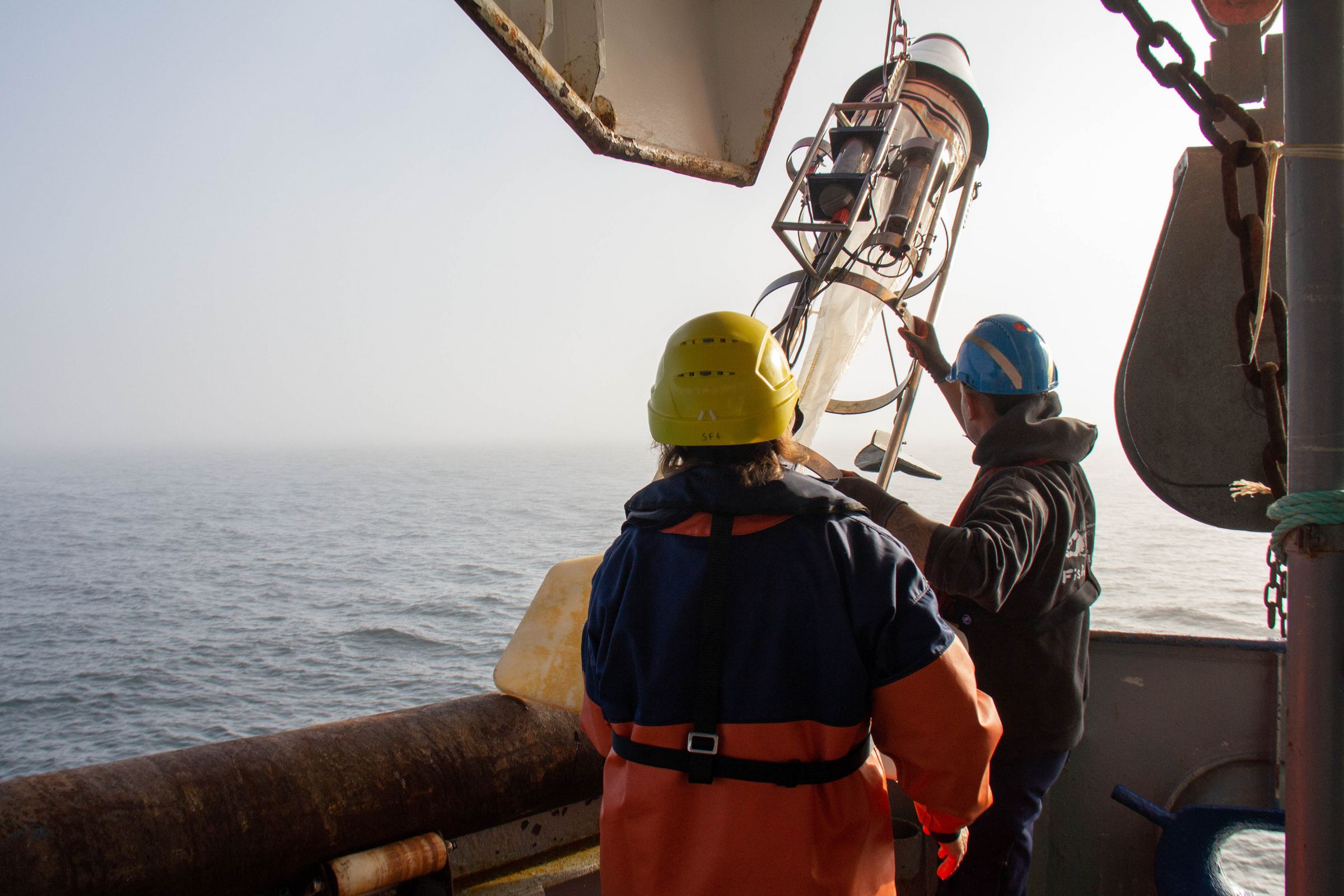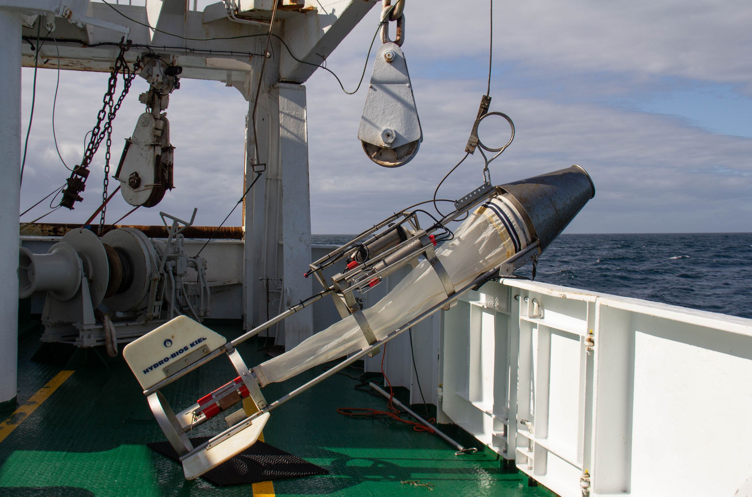 Auf einem festgelegten Stationsnetz setzen wir ein Planktonfanggerät, den sog. „Nackthai“ ein, welches seitlich oder hinter dem Forschungsschiff durchs Wasser gezogen wird. An jeder Station wird der Nackthai durch die gesamte Wassersäule gezogen - von der Oberfläche bis knapp über den Grund und wieder zurück.