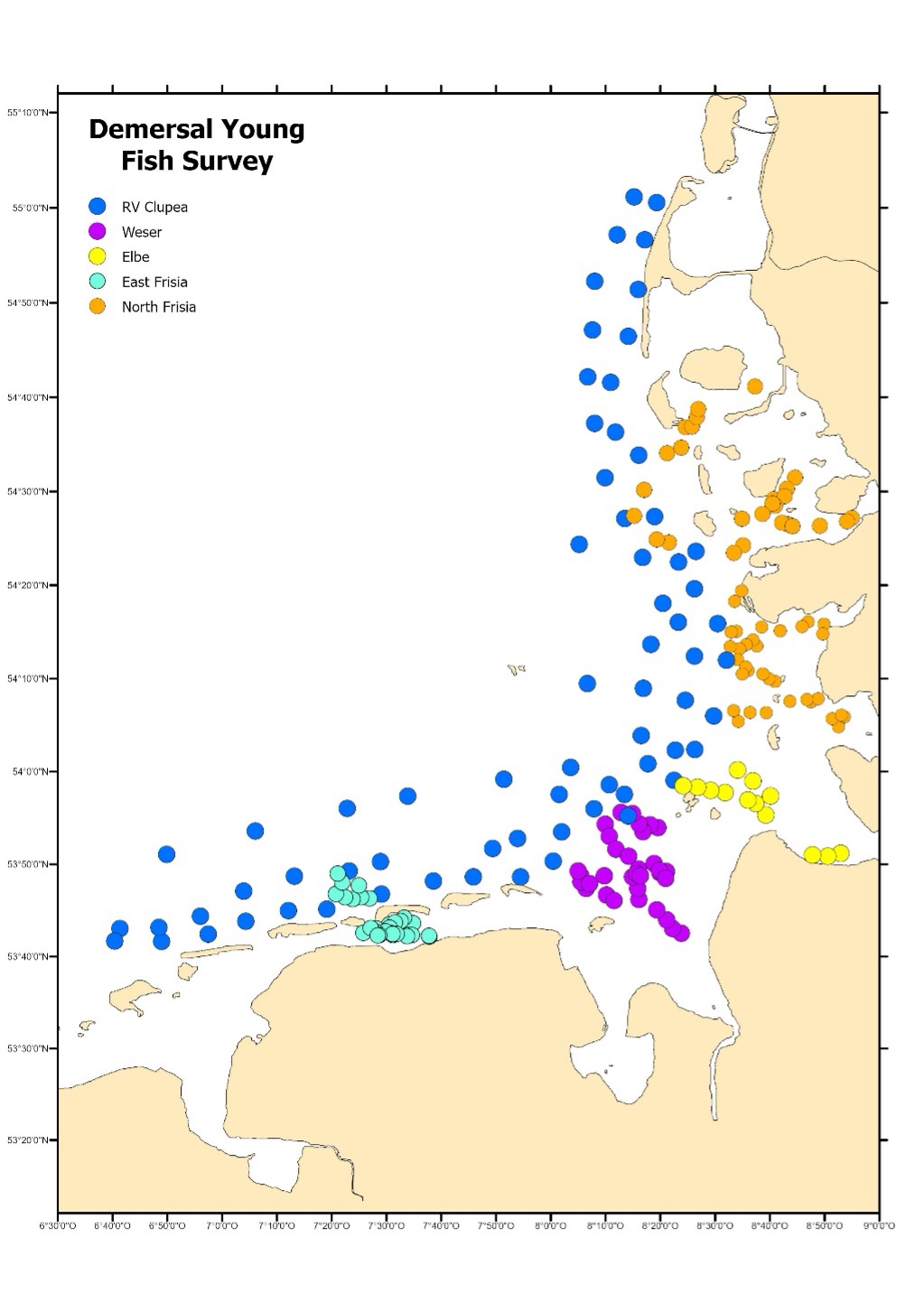 Seit 1974 wird der deutsche Anteil des DYFS jährlich vom Institut für Seefischerei in der Deutschen Bucht und in großen Teilen des deutschen Wattenmeeres durchgeführt. Aufgrund der hohen Relevanz für die Einschätzung der Bestandsgrößen von Jungfischen ist der DYFS ein verpflichtender Survey im EU-Datenerhebungsprogramm (DCF). Das Hauptziel dieser Erhebung ist nach wie vor die Abschätzung der nachwachsenden Jahrgänge der wichtigsten kommerziell genutzten Plattfischarten. Diese Rekrutierungsindizes sind ein wichtiger Teil der vom ICES koordinierten Abschätzung der Fischbestandsbiomasse und den daraus abgeleiteten Fangempfehlungen. Darüber hinaus zielt diese Erhebung aber auch auf die Abundanz und die Verteilung der Nordseegarnele (Crangon crangon) und anderer demersaler Fisch- und Epibenthosarten ab.